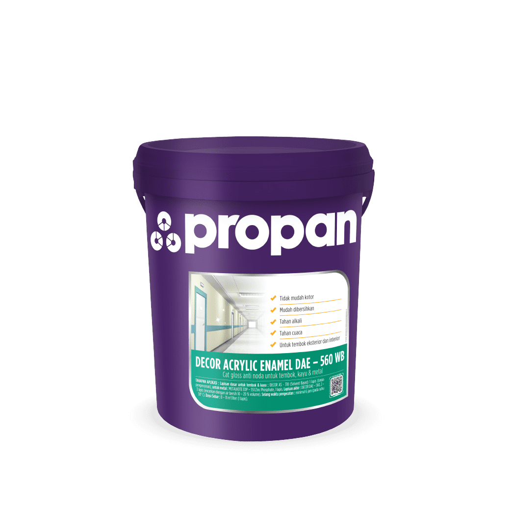 DECOR Acrylic Enamel DAE – 560 WB adalah cat acrylic gloss enamel water based yang terbuat dari bahan acrylic emulsion dan pigmen warna pilihan dengan system untuk pengecatan dinding interior dan eksterior area publik yang sering dilalui orang, area sekitar lift, koridor, area tangga darurat, area parkir dan area produksi pabrik & gudang, dengan ketinggian ± 1,2 meter dari lantai. DECOR Acrylic Enamel DAE – 560 WB memiliki daya lekat yang baik ke berbagai macam substrat seperti tembok pasangan batu bata/plesteran semen, beton, panel GRC, kayu, gypsum, dan lain-lain. Produk ini memiliki kualitas lapisan film yang tidak mudah kotor, mudah dibersihkan dan dapat dicuci, memiliki ketahanan yang baik terhadap cuaca, alkali, sinar UV, air, bahan kimia rumah tangga dan gesekan. Produk ini mudah diaplikasikan, cepat kering dan tersedia dalam berbagai warna pilihan.