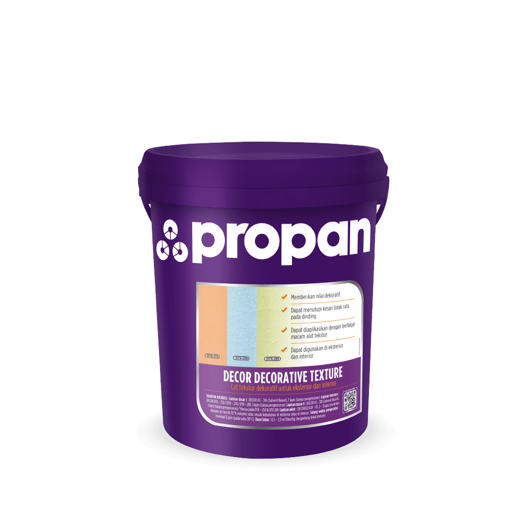 DECOR DECORATIVE TEXTURE DTX – 250 (Water Based) adalah texture yang terbuat dari bahan acrylic emulsion, yang dikombinasikan dengan filler khusus yang tahan air dan memiliki ketahanan terhadap pengaruh cuaca. Lapisan DECOR Decorative Texture DTX – 250 (Waterbased) memberikan nilai dekoratif sekaligus membantu menghilangkan kesan tembok yang tidak rata dan bergelombang.